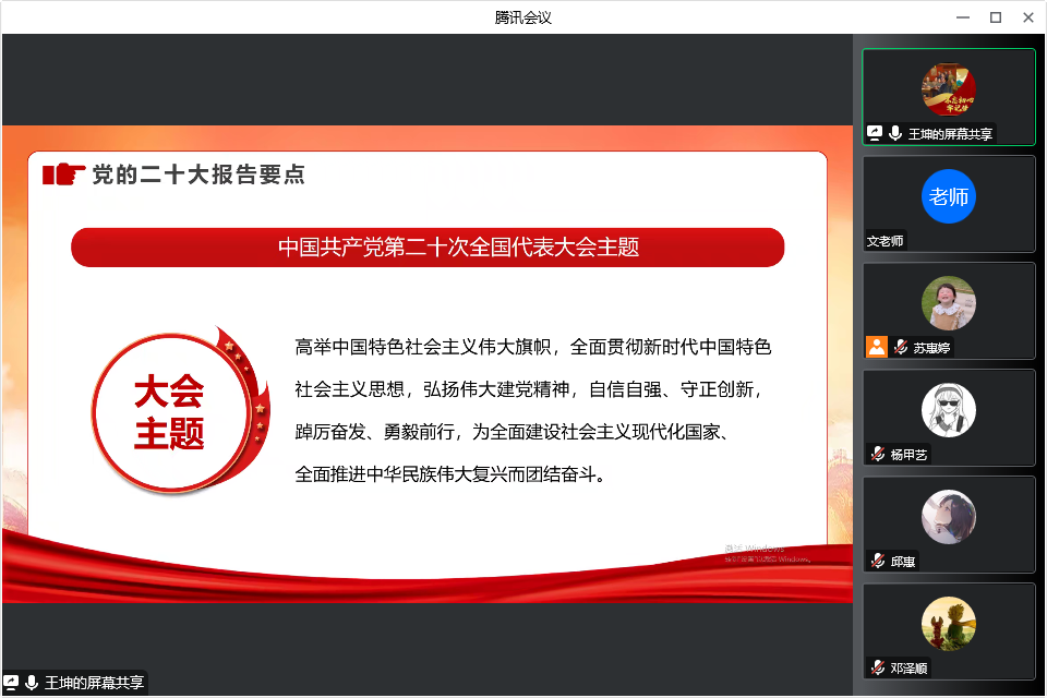 为深入学习宣传贯彻党的二十大精神,扎实推动党的二十大精神在学院落地见效,我院立足广大师生思想和工作实际,组织开展“党委委员宣讲二十大凝心聚力共赴新征程”系列主题宣讲活动。11月17日,学院党委书记王坤通过腾讯会议平台为新确定的入党积极分子及学生党员做题为“学习党的二十大精神 做信仰坚定的青年大学生党员”专题讲座,开启本期系列主题宣讲活动第一讲。