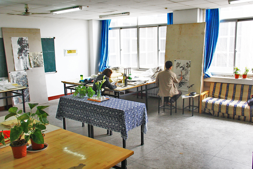 国画工作室:该工作室现有六张国画案,还有整面毛毡墙。该工作室主要承担师生国画创作的任务。