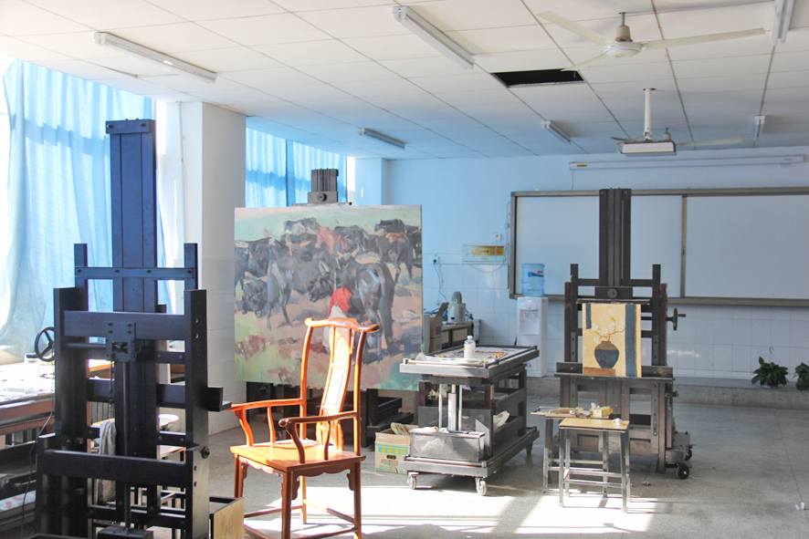 油画工作室:现有大型专业画架7张、大型专业画车7个等设备。该工作室主要承担师生油画创作的任务。
