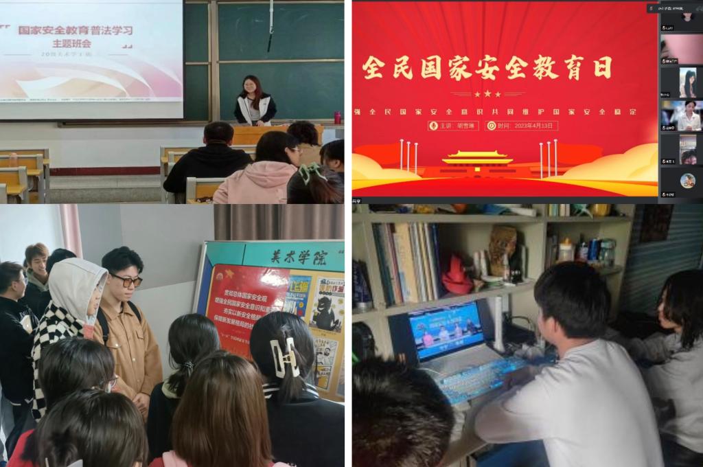 全院师生紧密围绕“贯彻总体国家安全观,增强全民国家安全意识和素养,夯实以新安全格局保障新发展格局的社会基础”的主题,通过演讲、问答、讨论等方式,线上线下相结合积极开展主题班会;组织师生积极参与线上教育学习,营造良好活动氛围;同时利用学院滚动屏幕,播放关于国家安全教育公开课等视频资源;利用微信公众号“团聚美院”发布相关推文,开展国家安全教育宣传;并结合学院实际,组织学生开展主题海报设计、微电影拍摄等形式多样的活动。