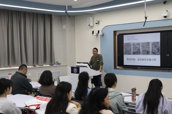 本次讲座,刘智勇围绕“图词同构”的主题,从“符号”到“叙事”,深入浅出地阐述了图像作为信息载体如何通过叙述传递给观众;从“意义”过渡到“意味”,引导听众深入体会作品背后的丰富情感与深刻思考;以“连续时空”到“视觉构成”为主线,详细剖析了连环画如何利用时空连续性创造出独特的视觉体验。期间,刘智勇展示了大量的图片资料,生动形象地介绍了连环画的创作形式及其内在涵义。刘智勇的精彩演讲拓宽了师生们对于连环画艺术的认知视野,提供了一种全新的鉴赏角度。